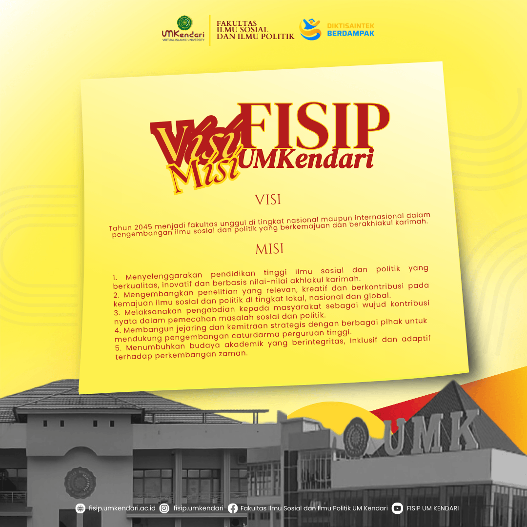 The 2045 Vision proclaimed by FISIP UMKendari is "To become a leading faculty at the national and international levels in the development of progressive and morally upright social and political sciences." This vision emphasizes global academic quality aligned with ethical and moral values.